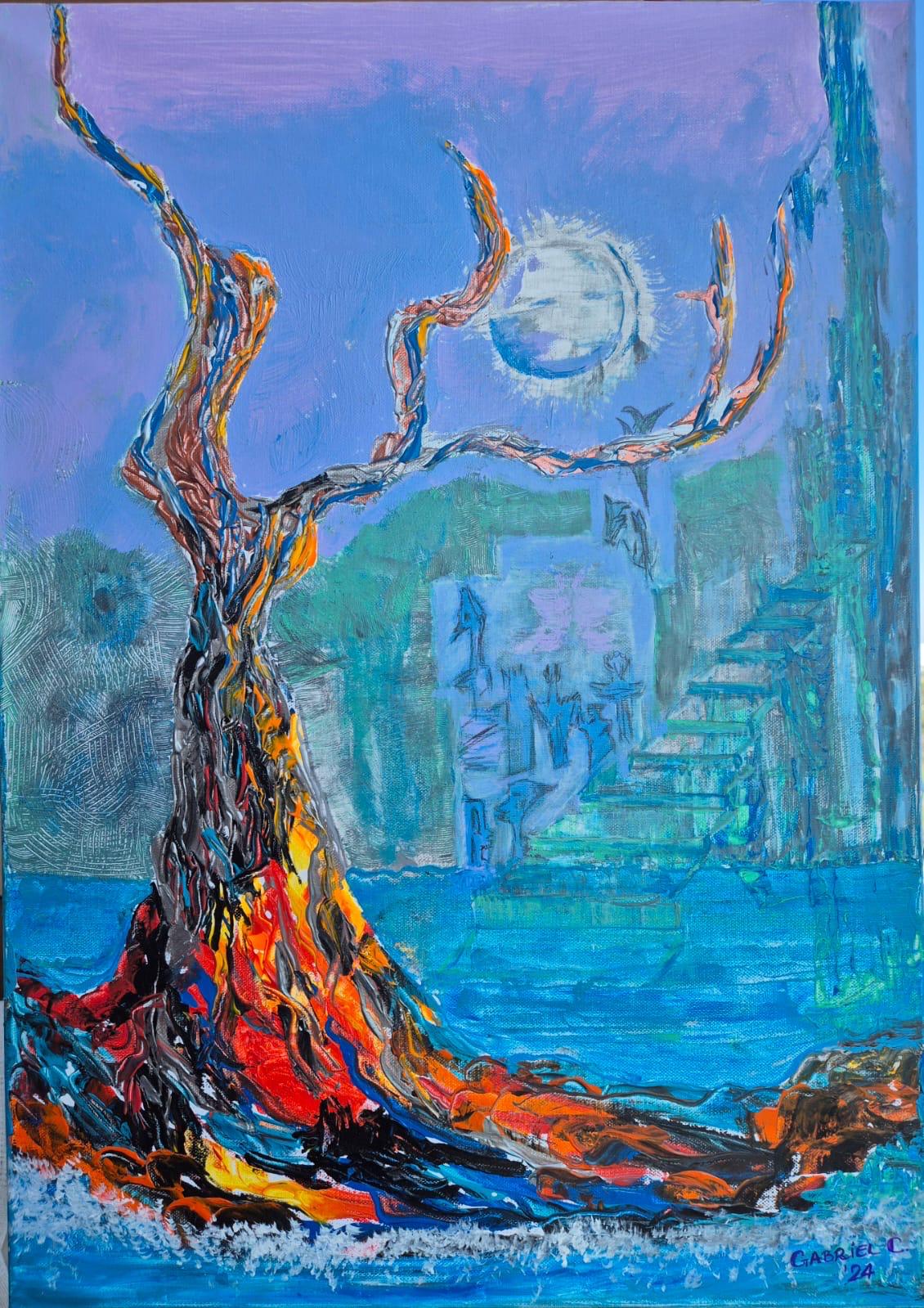 În această lucrare, Gabriel Ciobanu desenează o realitate stratificată, în care timpul nu este o linie, ci un arbore în flăcări. Trunchiul viguros urcă dintr-un sol incandescent, pictat cu nuanțe de lavă vie, ca o memorie a durerii arse, o combustie a ceea ce a fost.