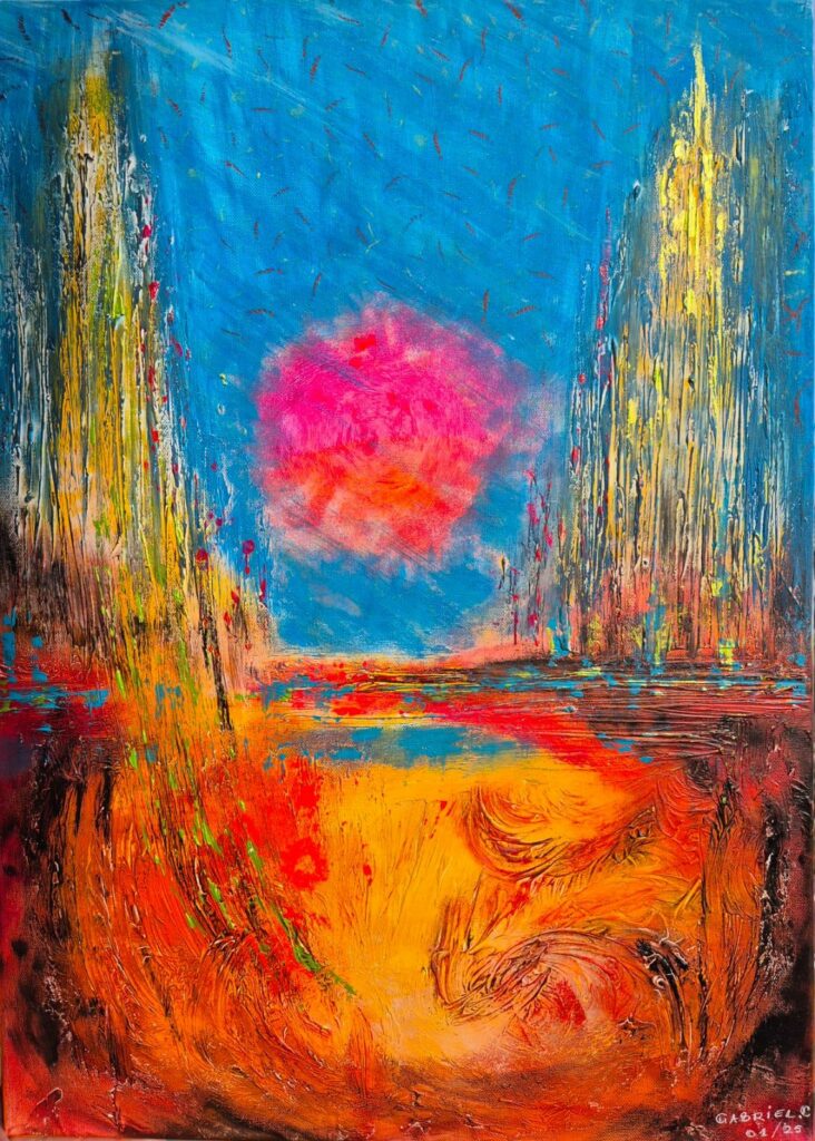 Gabriel propune aici o imagine a sfârșitului care creează – un apus care nu închide, ci redeschide. În locul unei tristeți romantice, lucrarea pulsează de vitalitate. Este o moarte înflăcărată care dă naștere unui nou răsărit, într-o lume unde focul nu mistuie, ci regenerează.